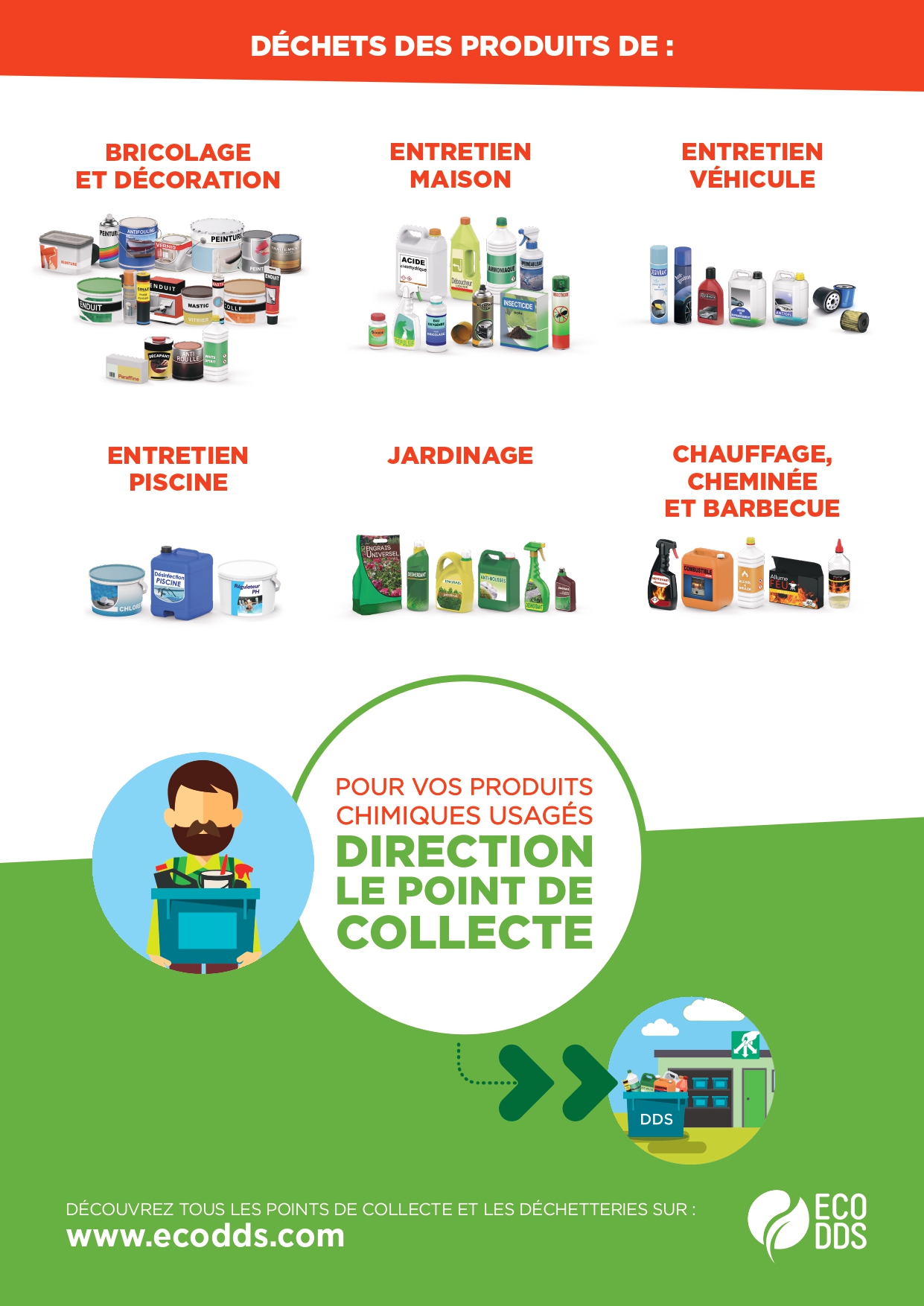 Vous savez bien Ă©videmment que certains dĂ©chets du quotidien ne doivent pas finir Ă  la poubelle ou dans la colonne de tri classique : dĂ©chets chimiques de bricolage, de jardinage, de dĂ©coration, d’entretien de maison, vĂ©hicule ou piscine, dĂ©chets des produits de chauffage, cheminĂ©e ou barbecue